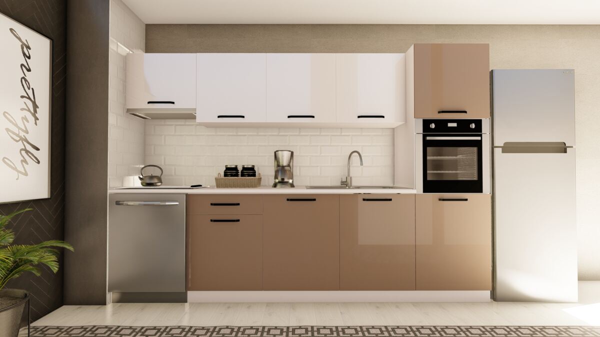 VİSAS CONCEPT _ 300 cm CANSU HAZIR MUTFAK DOLABI ASPİRATÖR ve ANKASTRE KİLER MODÜLLÜ PARLAK CAPPUCCINO