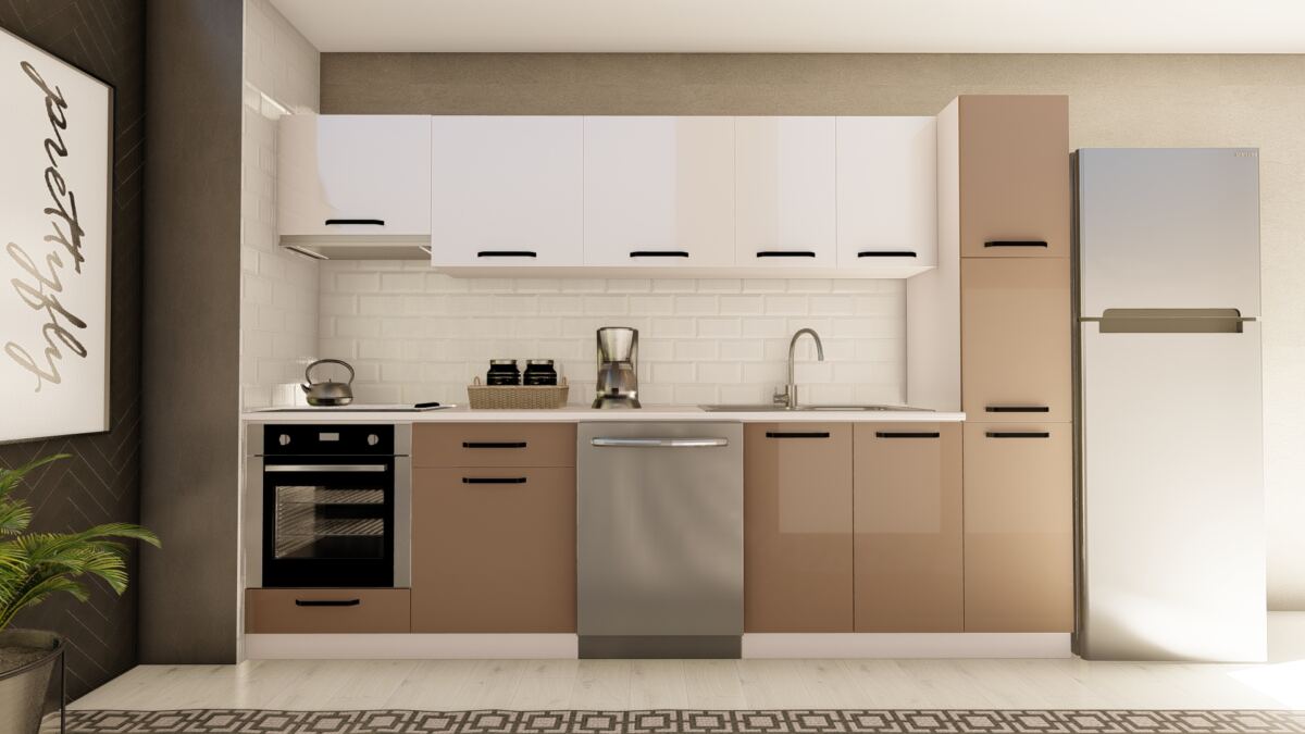 300 cm DEVİN HAZIR MUTFAK DOLABI ASPİRATÖR, ANKASTRE ve KİLER MODÜLLÜ PARLAK BEYAZ ve CAPPUCCINO