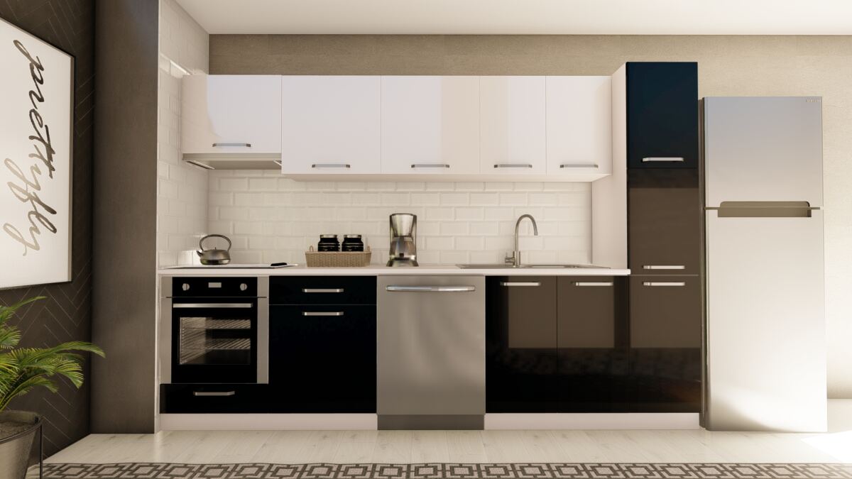 300 cm DİCLE HAZIR MUTFAK DOLABI ASPİRATÖR, ANKASTRE ve KİLER MODÜLLÜ PARLAK BEYAZ ve SİYAH