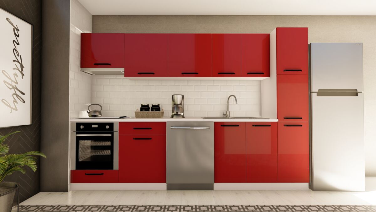 VİSAS CONCEPT _ 300 cm DORUK HAZIR MUTFAK DOLABI ASPİRATÖR, ANKASTRE ve KİLER MODÜLLÜ PARLAK KIRMIZI