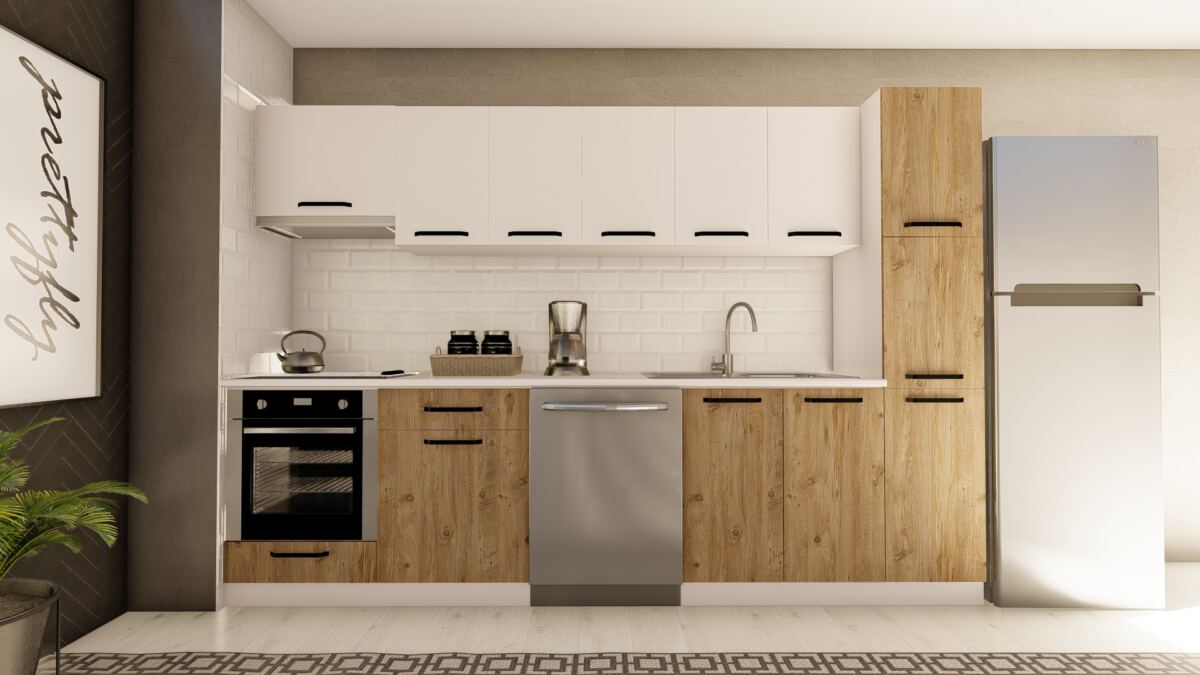 VİSAS CONCEPT _ 300 cm EKİN HAZIR MUTFAK DOLABI ASPİRATÖR, ANKASTRE ve KİLER MODÜLLÜ BEYAZ ve ATLANTİK ÇAM