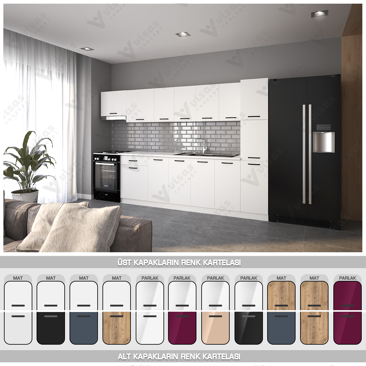 – Görselde yer alan buzdolabı, eviye (lavabo), tezgah, fırın, ocak, batarya, aspiratör vb. ürüne dahil değildir.
