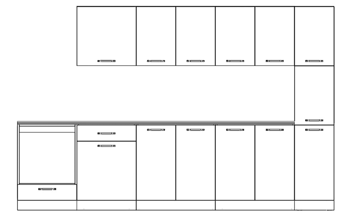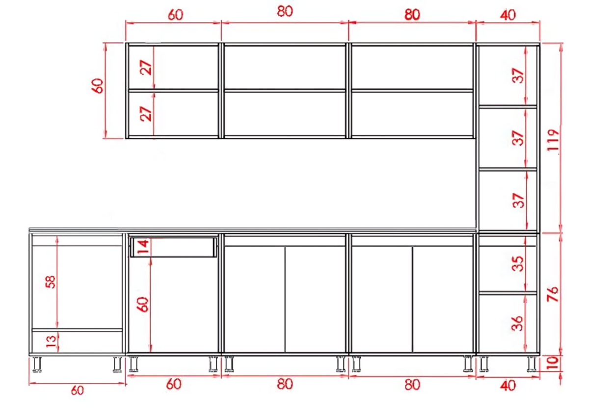 Alt Modüller : Genişlik (soldan sağa) : 60 + 60 + 80 + 80 + 40 = 320 cm Derinlik: 55 cm Yükseklik: 86 cm (91 cm e kadar yükseltilebilir)